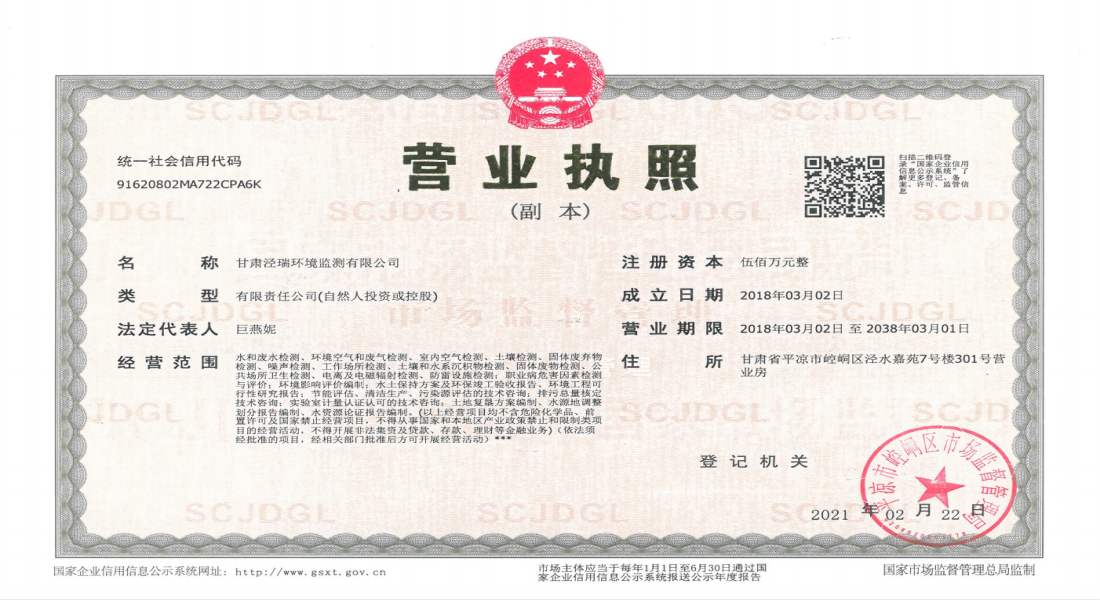 甘肅涇瑞環(huán)境監(jiān)測有限公司營業(yè)執(zhí)照